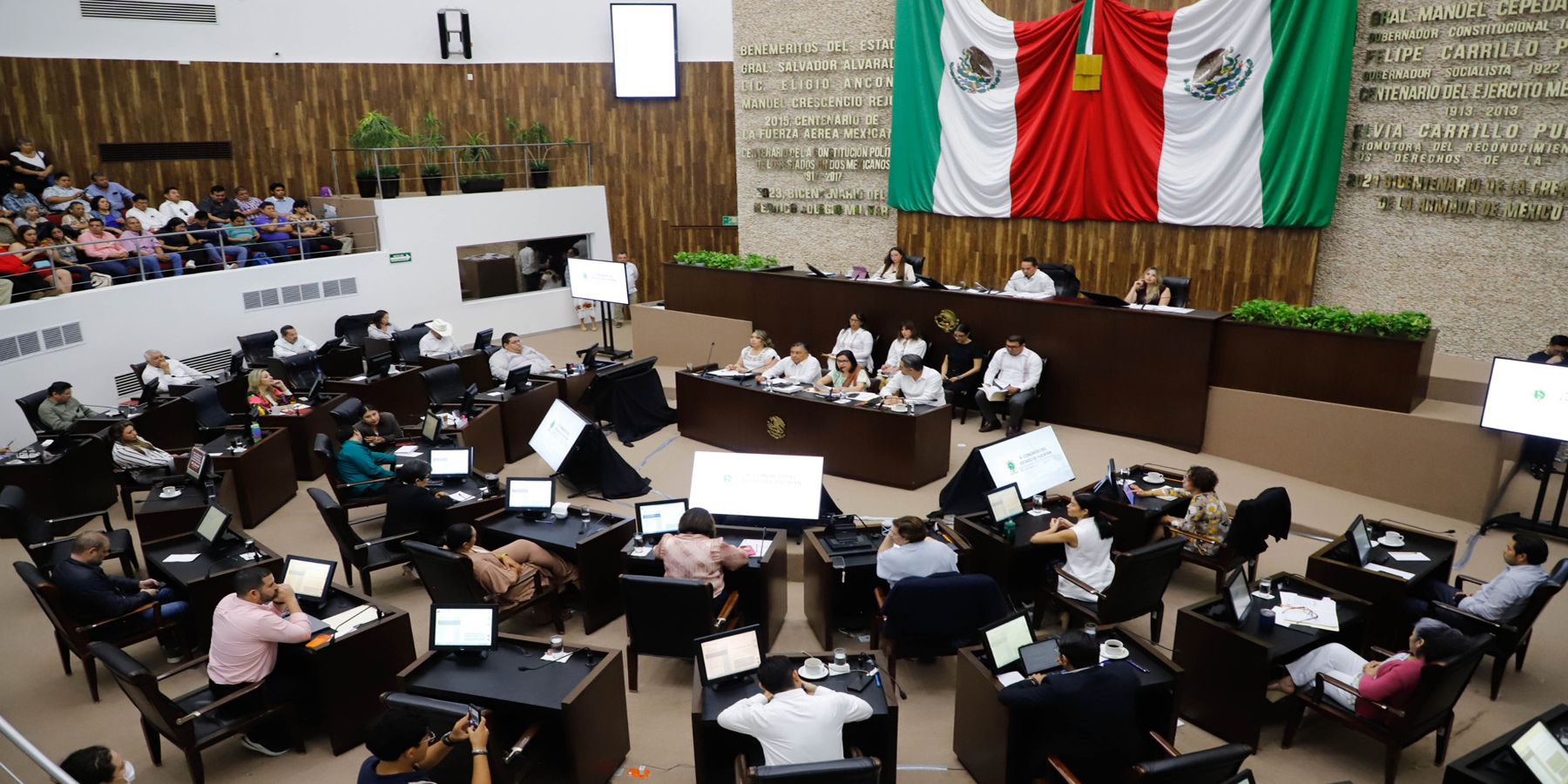 Ante el Pleno participaron el Secretario de Administración y Finanzas, Ing. Juan Gabriel Sánchez Álvarez; el Secretario de Economía y Trabajo, Lic. Jorge Ermilo Barrera Novelo; la Secretaria de Desarrollo Sustentable, Lic. Neyda Concepción Silva Rosado; la Secretaria de Infraestructura para el Bienestar, Mtra. Alaine Patricia López Briceño; el Director General de la Agencia de Energía, Lic. Pablo Gamboa Miner; y el Director General del Instituto de Vivienda del Estado de Yucatán (IVEY), Lic. Felipe Cervera Hernández.